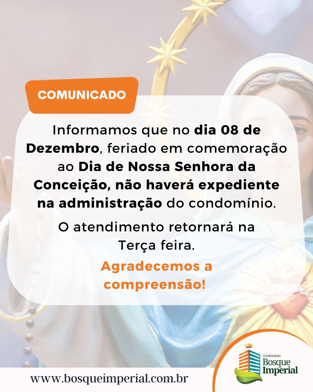 Informamos que no dia 08 de Dezembro, feriado em comemoração ao Dia de Nossa Senhora da Conceição, não haverá expediente na administração do condomínio.