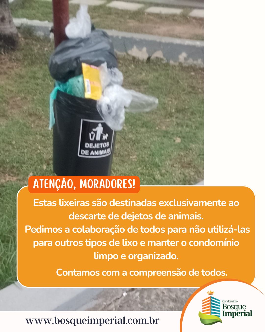 Contamos com a compreensão e colaboração de todos para mantermos o condomínio limpo e organizado. 🐾