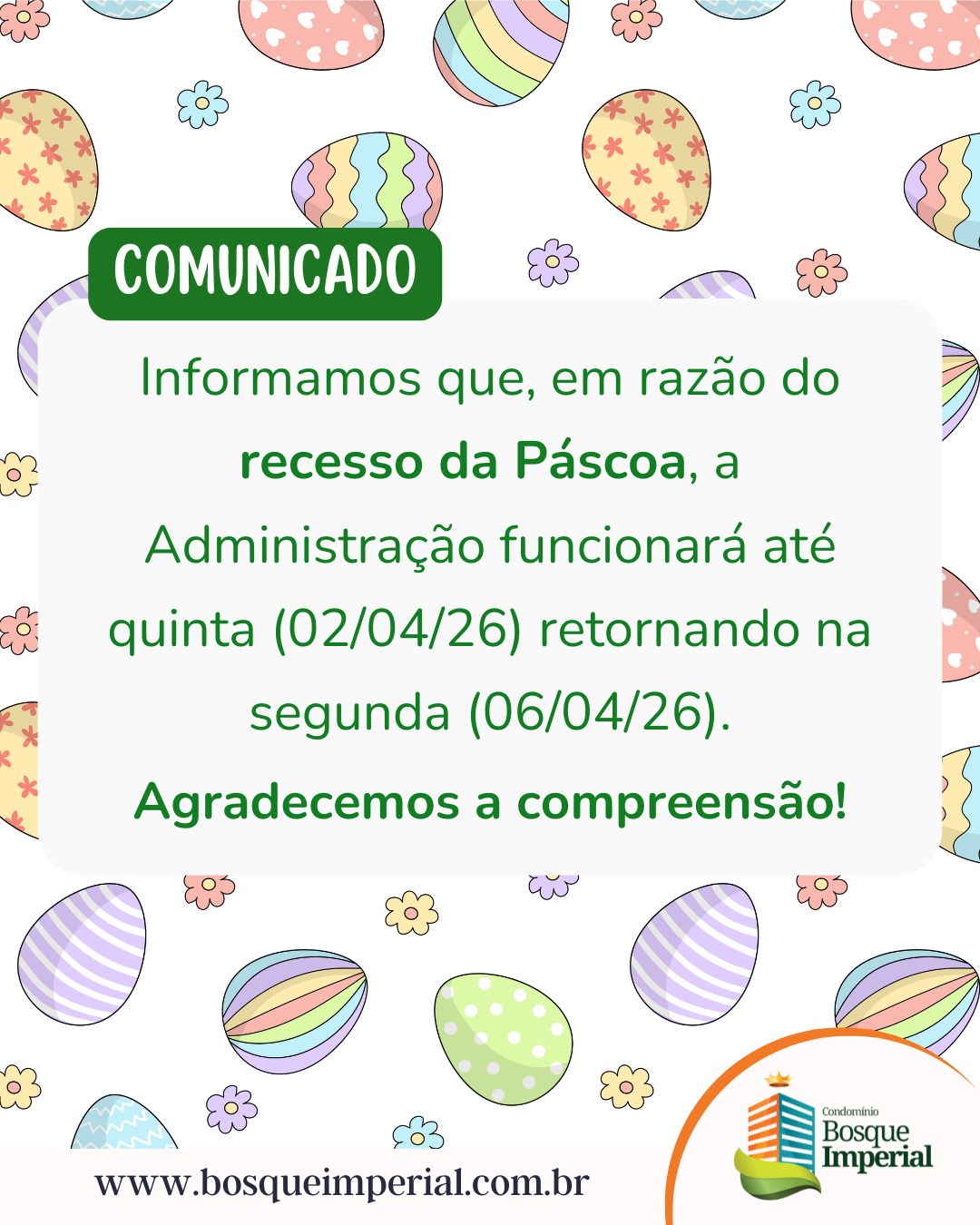 Informamos que, em razão do recesso da Páscoa, a Administração funcionará até quinta (02/04/26) retornando na segunda (06/04/26).
