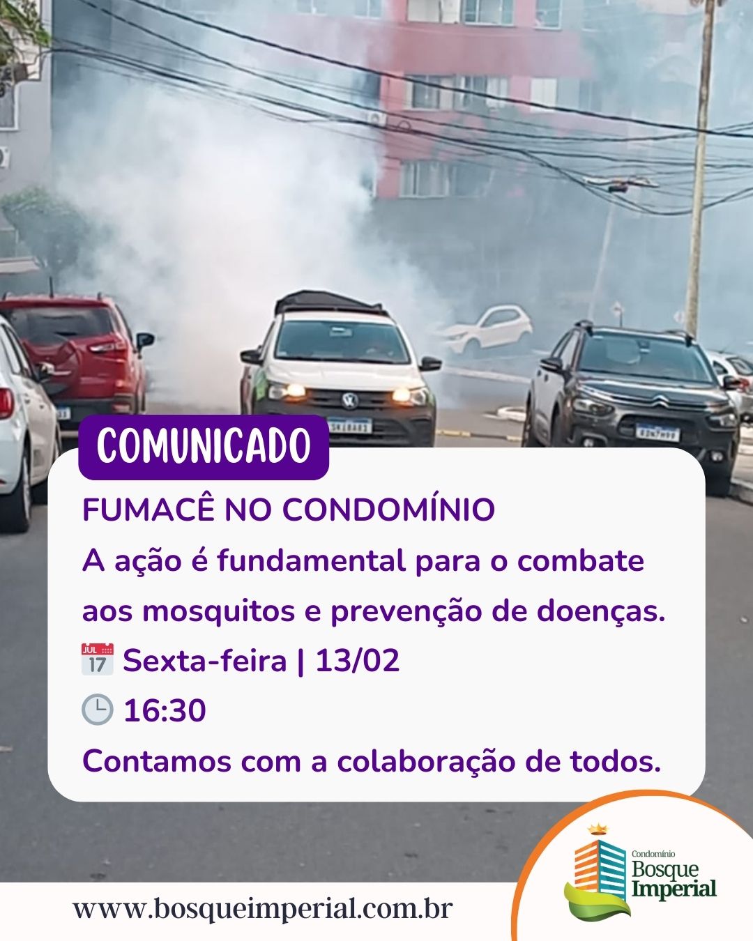 Será realizado o serviço de controle de mosquitos/muriçocas (fumacê) nas áreas comuns do condomínio nos dias: