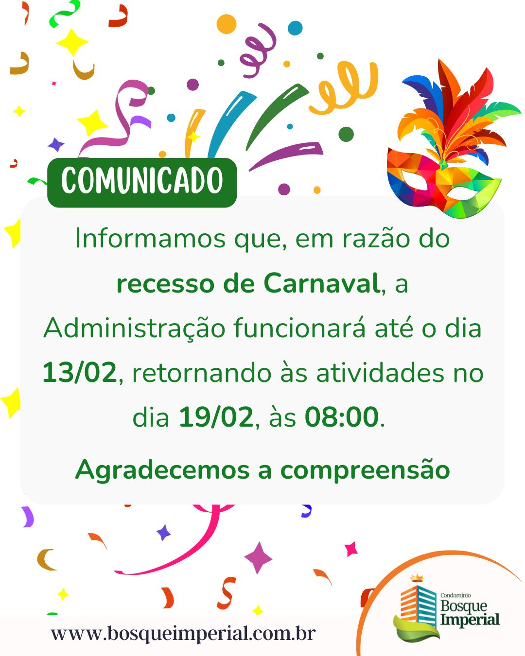 Informamos que, em razão do recesso de Carnaval, a Administração funcionará até o dia 13/02, retornando às atividades no dia 19/02, às 08:00.