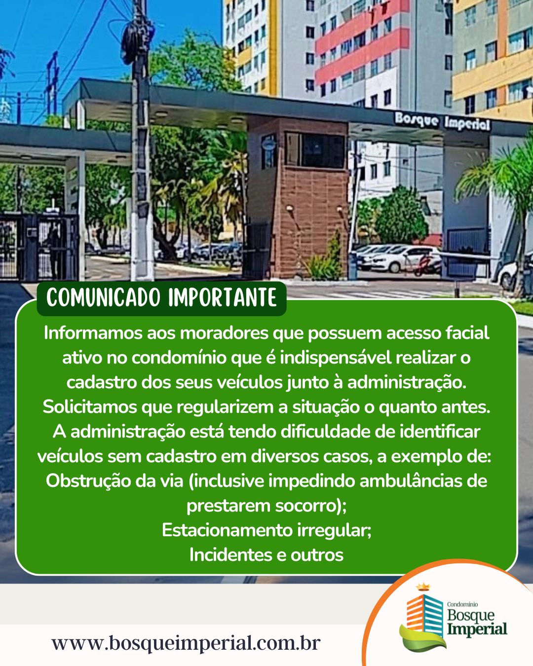 Informamos aos moradores que possuem acesso facial ativo no condomínio que é indispensável realizar o cadastro dos seus veículos junto à administração.
