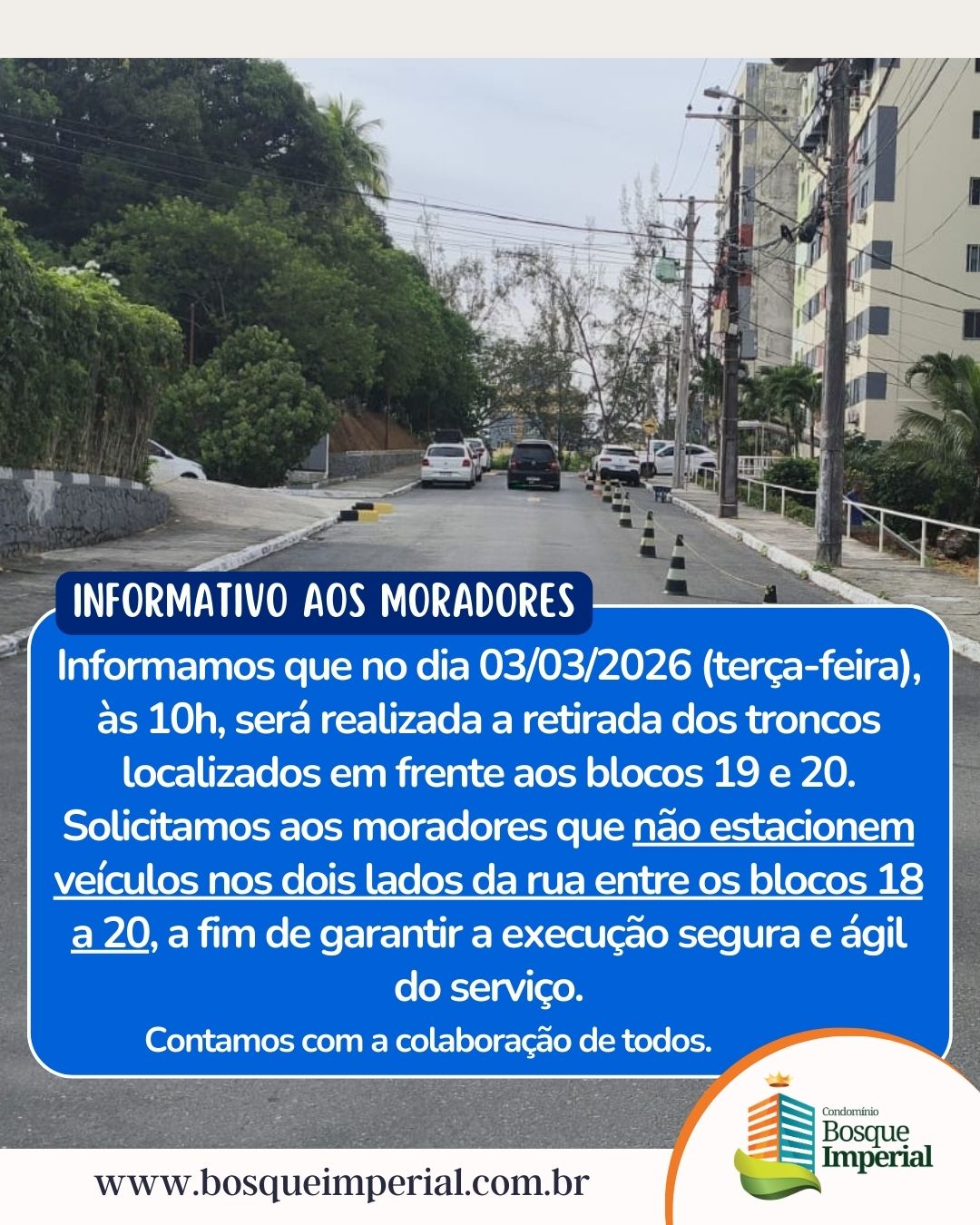 Informamos que no dia 03/03/2026 (terça-feira), às 10h, será realizada a retirada dos troncos localizados em frente aos blocos 19 e 20.