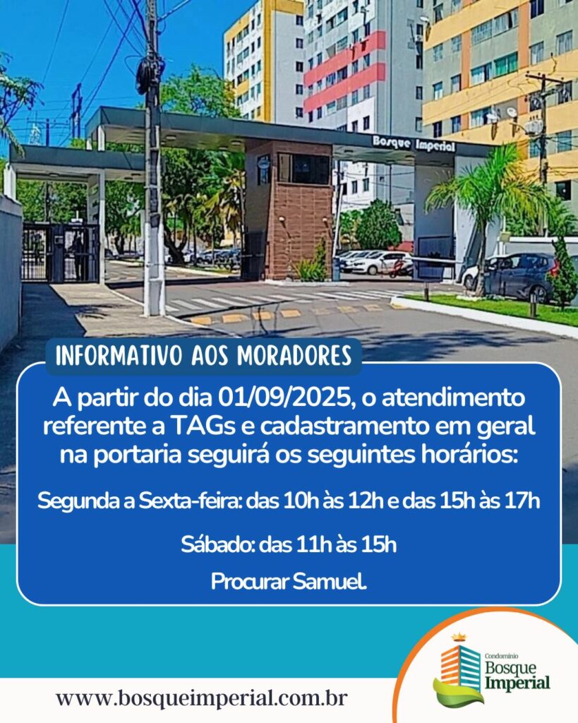A partir do dia 01/09/2025, o atendimento referente a TAGs e cadastramento em geral na portaria seguirá os seguintes horários: Segunda a Sexta-feira: das 10h às 12h e das 15h às 17h Sábado: das 11h às 15h Procurar Samuel.
