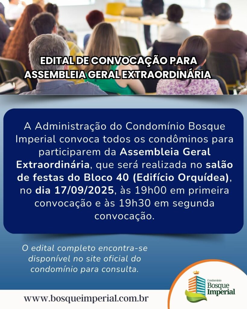 📢 EDITAL DE CONVOCAÇÃO – ASSEMBLEIA GERAL EXTRAORDINÁRIA 🔰 A Administração do Condomínio Bosque Imperial convoca todos os condôminos para participarem da Assembleia Geral Extraordinária, que será realizada no salão de festas do Bloco 40 (Edifício Orquídea), no dia 17/09/2025,…