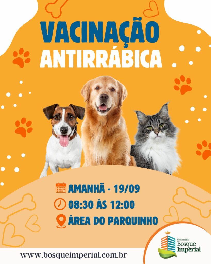 🐾 Vacinação Antirrábica 🐾 📅 Amanhã, 19/09 ⏰ Das 08h30 às 12h00 📍 Área do parquinho – Condomínio Bosque Imperial Não deixe seu pet de fora! 🐶🐱 Proteja quem você ama. 💉❤️