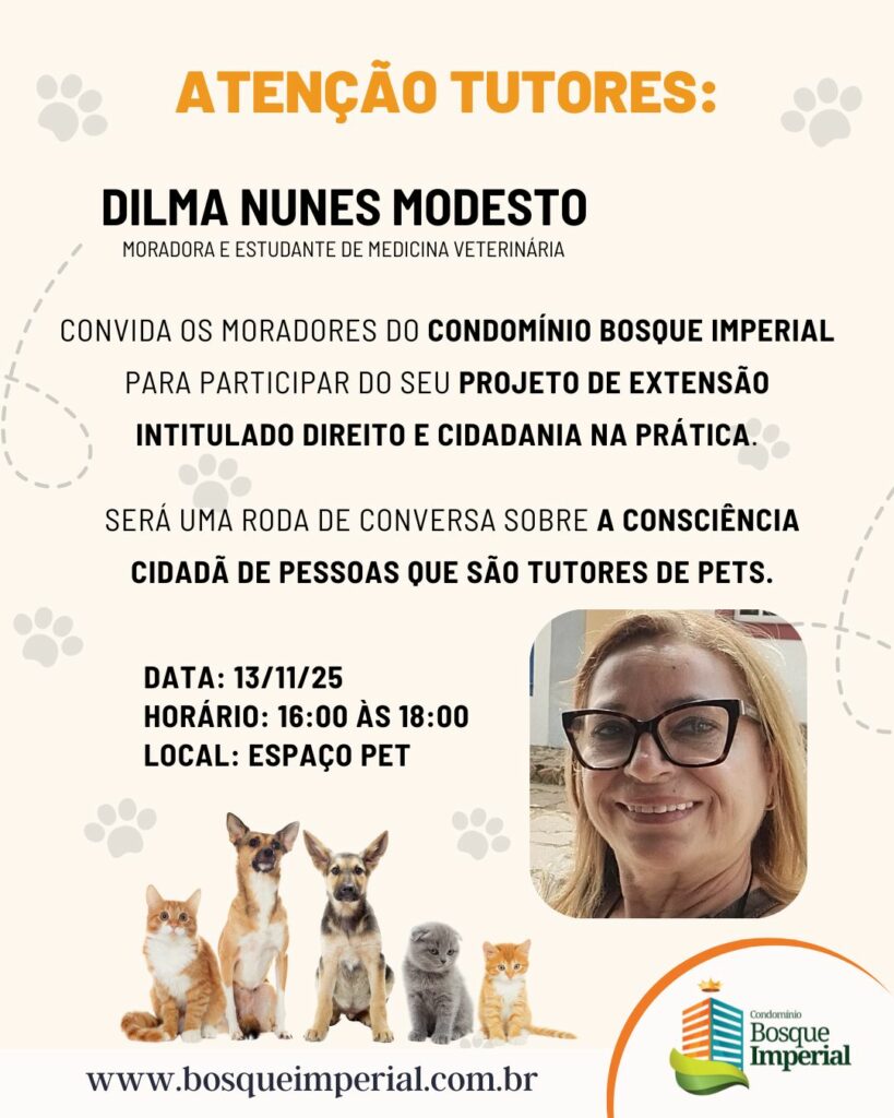 Dilma Nunes Modesto (moradora e estudante de Medicina Veterinária) Convida os moradores do Condomínio Bosque Imperial para participar do seu projeto de extensão intitulado Direito e Cidadania na Prática. Será uma roda de conversa sobre a consciência cidadã de pessoas…