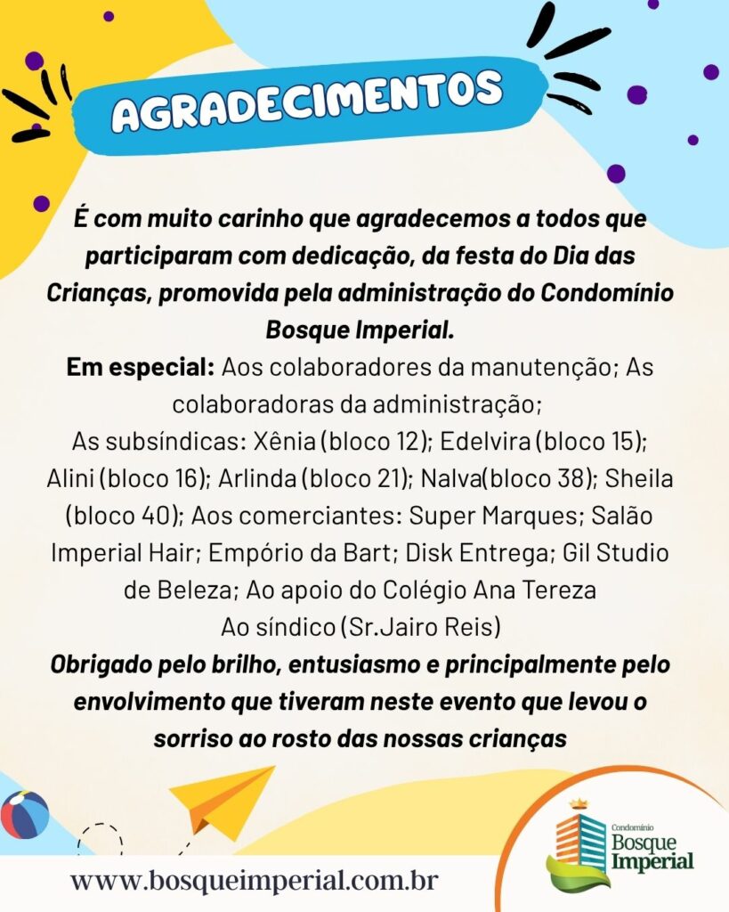 É com muito carinho que agradecemos a todos que participaram com dedicação, da festa do Dia das Crianças, promovida pela administração do Condomínio Bosque Imperial. Obrigado pelo brilho, entusiasmo e principalmente pelo envolvimento que tiveram neste evento que levou o…
