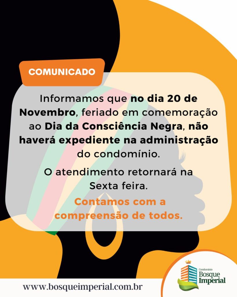 Informamos que no dia 20 de Novembro, feriado em comemoração ao Dia da Consciência Negra, não haverá expediente na administração do condomínio. O Atendimento retornará na Sexta feira. Contamos com a compreensão de todos.