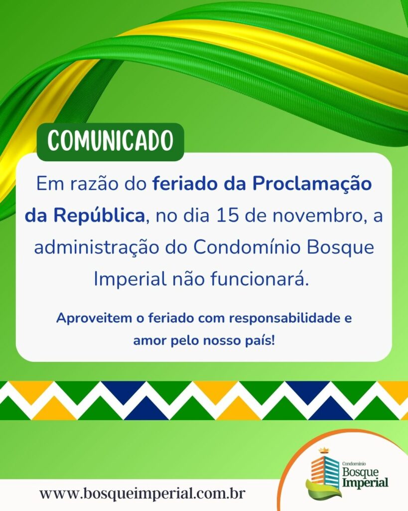 Comunicado Importante Em razão do feriado da Proclamação da República, no dia 15 de novembro, a administração do Condomínio Bosque Imperial não funcionará. Aproveitem o feriado com responsabilidade e amor pelo nosso país! 💚💛