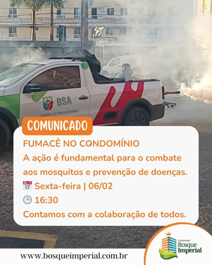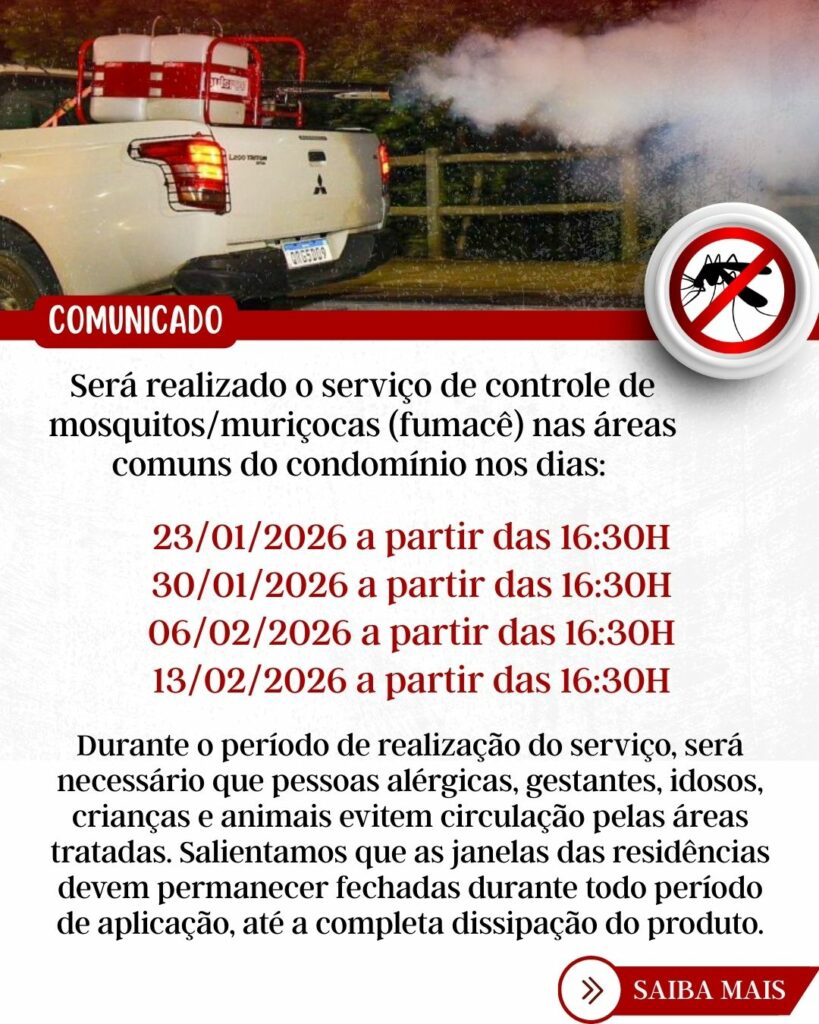 Será realizado o serviço de controle de mosquitos/muriçocas (fumacê) nas áreas comuns do condomínio nos dias: 23/01/2026 a partir das 16:30H 30/01/2026 a partir das 16:30H 06/02/2026 a partir das 16:30H 13/02/2026 a partir das 16:30H Fique atento aos locais:…