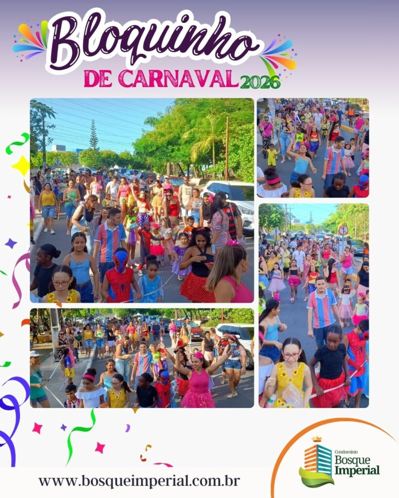 BLOQUINHO DAS CRIANÇAS Vamos colorir o condomínio com as crianças fantasiadas e fazer o 1º Bloquinho das Crianças acontecer! Concentração na quadra poliesportiva às 15:00. Daremos uma volta pelo condomínio e retornaremos ao espaço da quadra. Data: 28 de fevereiro…